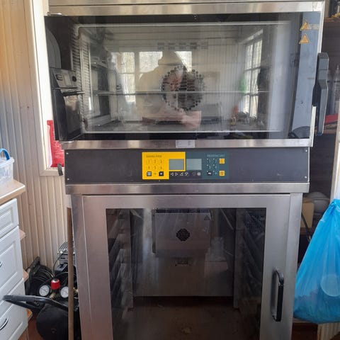 Teollisuusuuni ja uunipeltteline. Uunissa mekaaniset säätimet lämpötilalle, ajastimelle ja uunitoiminnoille. Uunin vieressä erillinen metallinen uunipeltteline useilla tasoilla, mukana useita peltejä ja useita aaltopeltejä esimerkiksi leivontaan. Soveltuu ammattikeittiöön tai muuhun suurkeittiökäyttöön.