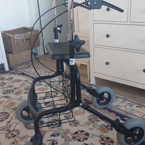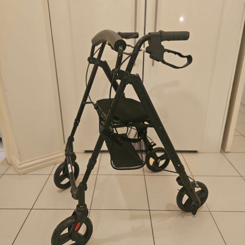 Rollaattori, jossa on etukori ja irrotettava tarjotin. Mallissa on neljä pyörää, käsijarrut ja työntökahvat. Sopii liikkumisen tueksi sisä- ja ulkokäyttöön. Runko on metallinen ja väri tummansininen. Etukori tarjoaa tilaa pienten tavaroiden kuljettamiseen, ja tarjotin helpottaa esineiden siirtämistä huoneesta toiseen. Nouto käteinen.