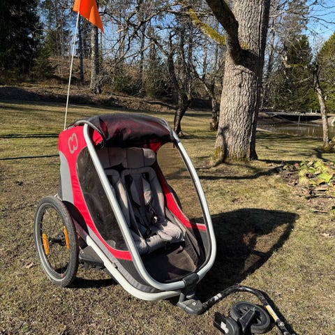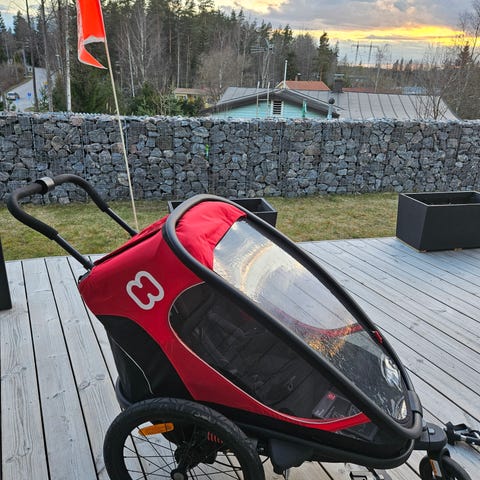 Kaikinpuolin siistissä kunnossa. Ostettu uutena -23. Kangas siisti kaikinpuolin, mutta vähän likaa ja hieman sään tuomaa jälkeä löytyy. Tän kanssa on superhyvä polkea ja lapset viihtyneet hyvin kyydissä kelillä kuin kelillä. Simppeli kiinnitys pyörään. Saa kasaan ja autoon kompaktisti kyytiin. Ovh yli 800e.