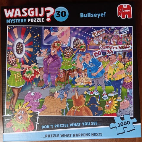 Wasgij Mystery Puzzle -sarjan 1000 palan palapeli. Kuvassa sarjakuvamainen, humoristinen kohtaus sisätilasta. Sopii aikuisille ja vanhemmille lapsille, jotka pitävät haastavammista palapeleistä. Pakkaus on englanninkielinen ja sisältää ohjeen, jossa ideana on koota se, mitä kuvassa tapahtuu seuraavaksi, ei pelkästään laatikon kantta esittävää kuvaa.