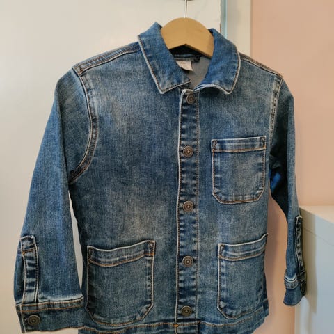 Zara farkkutakki lapsille, koko 104. Sininen denim-materiaali. Unisex-malli, jossa pitkät hihat, kaulus ja nappikiinnitys edessä. Edessä kaksi rintataskua napeilla ja takana yksinkertainen leikkaus. Sopii arkipukeutumiseen ja kerrospukeutumiseen lapsille noin koossa 104 cm.