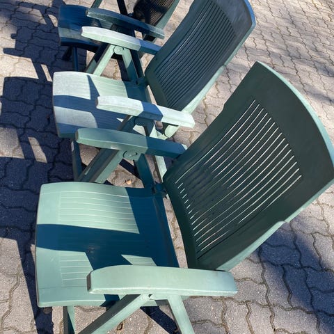 Säädettävät terassituolit ulkokäyttöön. Tuoleissa on metallirunko ja harmaa raidallinen kangasistuin sekä -selkänoja. Selkänoja on korkea ja istuinosassa on käsinojat. Sopivat parvekkeelle, terassille tai pihalle istuimiksi. Tuolit ovat kevyet ja ne voidaan taittaa kasaan säilytystä varten.