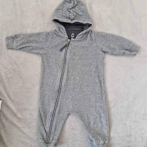 Kaunis hempeän aprikoosin värinen hupullinen jumpsuit vauvalle. Edessä hieman jotain tummaa tahraa, en ole yrittänyt tahranpoistoa. Muuten erinomaisessa kunnossa.