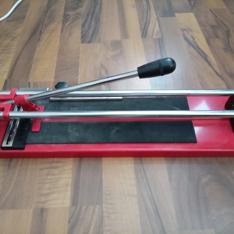 Käsikäyttöinen metallinen laattaleikkuri keraamisten laattojen leikkaamiseen. Varustettu ohjurilla ja leikkuurullalla suorien leikkausten tekemistä varten. Sopii esimerkiksi remontti- ja laatoitustöihin. Mukana kuvassa myös laatoituksen apuvälineitä, kuten hammastettu lasta/pala, jotka voivat kuulua kokonaisuuteen myyjän ilmoituksen mukaan.