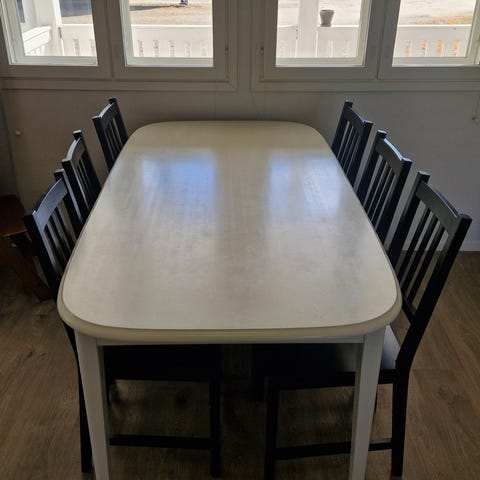 Isoon valkoiseen ruokapöytään mahtuu jopa 8 henkilöä. Mukana tulee myös 4 mukavaa tuolia.