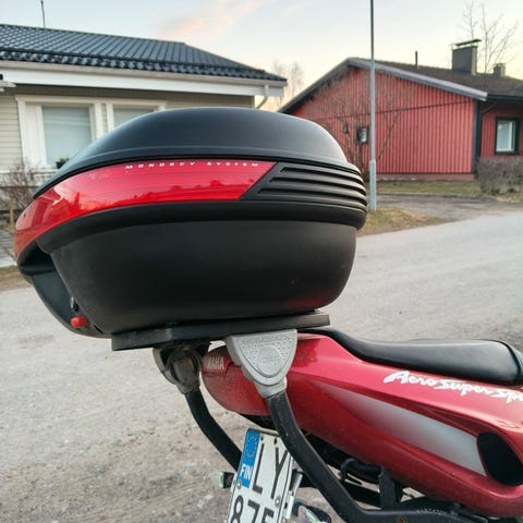 Shad SH25 moottoripyörän takalaukku. Kovamuovinen, musta laukku, jossa punainen heijastinosa takana. Laukku avautuu ylhäältä ja tarjoaa säilytystilaa esimerkiksi kypärälle tai muille ajovarusteille. Soveltuu asennettavaksi moottoripyörän tai skootterin takatelineeseen yhteensopivan kiinnitysjärjestelmän avulla.