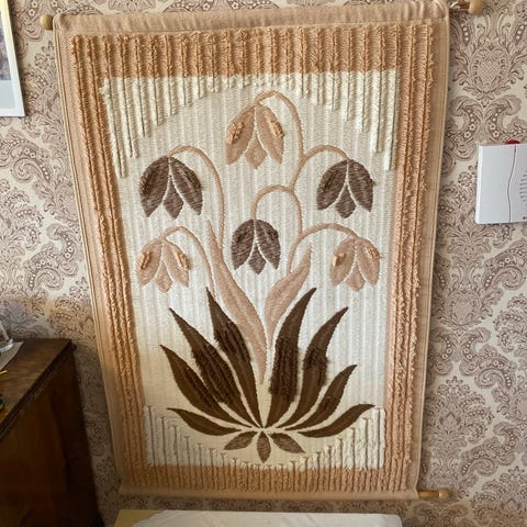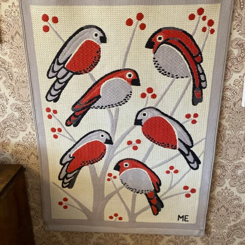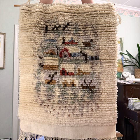 Ryijy tarvikkeita, toisessa jämä langat ja toisessa valmiin ryijyn tarvikkeet jotka on jäänyt kesken.