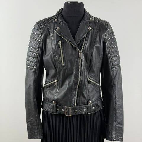 Aidosta nahasta valmistettu biker-malli, jossa upeat niititetyt olkapäät, vetoketjut ja vyö.