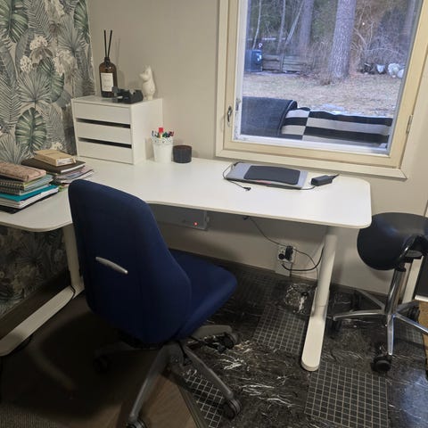 Puinen kirjoituspöytä, jossa molemmissa päissä laatikostot säilytystä varten. Toisella puolella on useita vetolaatikoita ja toisella puolella kaappi, jossa on hyllyvälilevyjä esimerkiksi papereille tai kansioille. Pöydässä on puinen kansi ja kartiomaiset jalat. Sopii työpöydäksi tai säilytyskalusteeksi kotiin tai toimistoon.