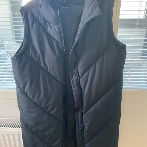 H&M naisten liivi, koko M, vähän oversized. Väri musta. Materiaali 100 % polyesteriä (päällinen, vuori ja toppaus). Edessä vetoketjukiinnitys ja kaksi vinoa etutaskua. Helmassa kiristysnyöri. Hihaton, toppamallinen liivi soveltuu käytettäväksi esimerkiksi välikerroksena tai kevyenä ulkovaatteena viileämpiin päiviin.