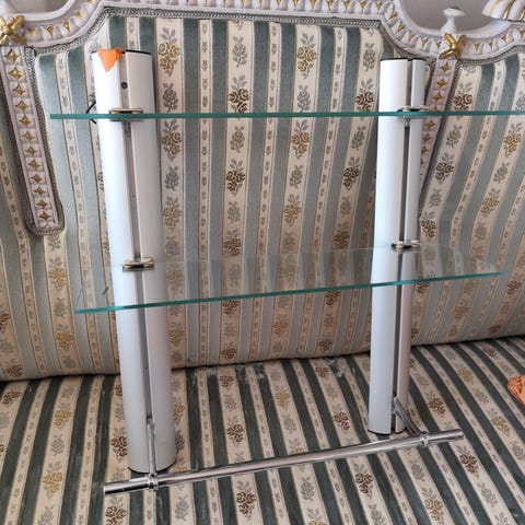 Suihkun kulmahylly teleskooppitangolla. Metallinen, krominvärinen rakenne, jossa useita ritilähyllyjä pesuaineiden ja muiden suihkutarvikkeiden säilytykseen. Soveltuu asennettavaksi kylpyhuoneen nurkkaan lattian ja katon väliin ilman porausta, tangon pituus säädettävissä tilan korkeuden mukaan. Max korkeus 220 cm.