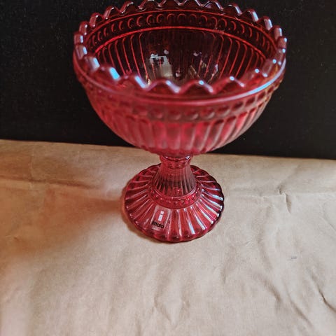Iittala Mariskooli -malja luumunpunaisesta lasista. Klassinen jalallinen lasimalja, jossa on koristeellinen, uurrettu pinta ja aaltoileva reuna. Sopii esimerkiksi tarjoiluun tai sisustuselementiksi. Materiaali värillistä lasia, väri tummanvioletti. Korkeus 15,5 cm. Ei ole ollut käytössä. Mariskooli-stanssi, joka näkyy kuvassa. Vain nouto.