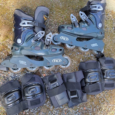 Vähän käytetyt lasten rullaluistimet varusteineen., koko 35-36 (US koko 4)