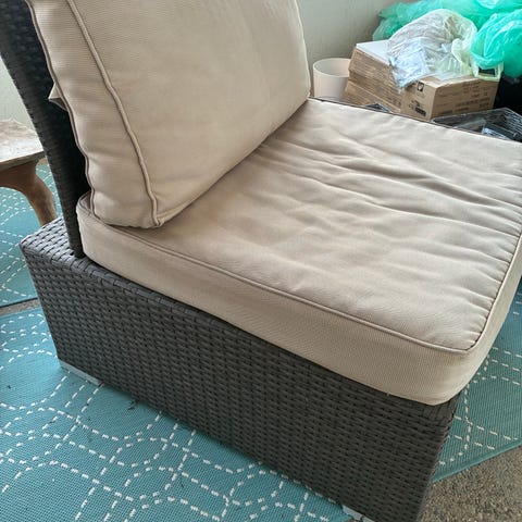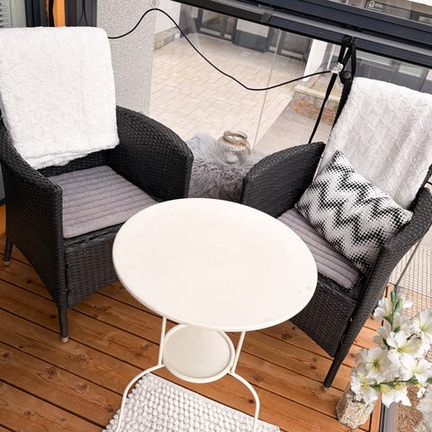 Varattu! Parvekkeelle koko setti: rottinkituolit, pöytä, viltit ja pehmusteet