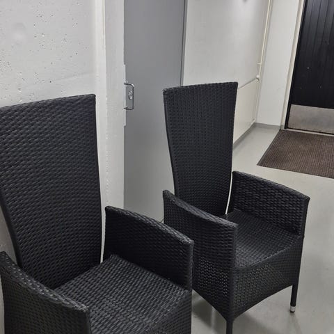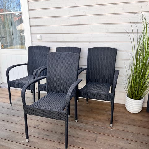 Parveketuolit polyrottinkia, joissa harmaat istuinpehmusteet. Tuoleissa on käsinojat ja korkea selkänoja. Sopivat parvekkeelle tai terassille ulkokäyttöön. Joko settinä tai yksitellen.