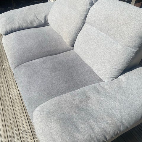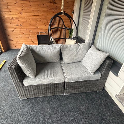 Myydään tarpeettomana tumman harmaa sohva + kahden erillisen istuimen terassikaluste-ryhmä pehmustetuilla. Nouto, maksu mp/käteinen.