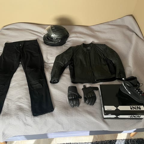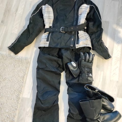 Täydellinen paketti moottoripyöräilyyn. Sisältää ajoasun, kengät ja kypärän. sekä hanskat.