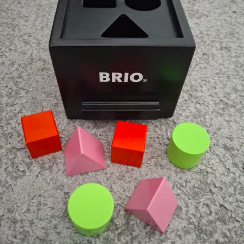 BRIO leikkipalikka, jossa sininen yläosa ja valkoinen alaosa. Yläosassa on kuusi eriväristä pyöreää nappia (punainen, keltaiset ja vihreät). Lelu soveltuu pienille lapsille nappeihin paineltavaksi ja käsittelyharjoituksiin. Muovinen rakenne, neljä jalkaa alaosassa, joita vasten lelu seisoo tukevasti lattialla tai pöydällä.