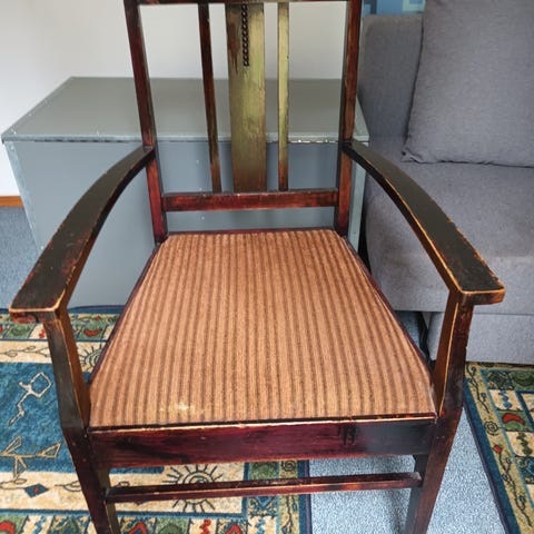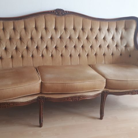 Leveys 162cm, syvyys 68cm ja istuimen korkeus 41cm. Verhoilu rikki yhdestä kohtaa istuimesta.