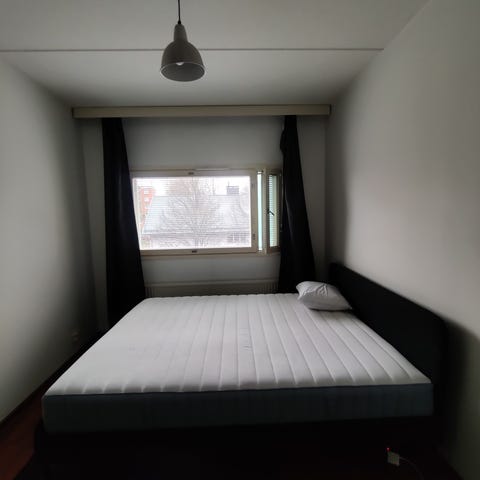 Patjat ovat aivan uudenveroiset ja pohjapatjassa on ylimääräinen päällinen.. Sotka sänky harmaalla verhoilulla. Sängyssä on suorakaiteen muotoinen, pehmustettu päätylevy ja mustat, suorat jalat. Patja on yhtenäinen ja sijoitettu runkopedin päälle. Sänky soveltuu kahdelle nukkujalle ja makuuhuonekäyttöön. Tarkemmat mitat ja patjan ominaisuudet eivät käy ilmi kuvista.