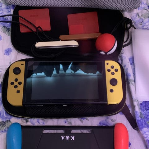 Mukana itse konsoli alkuperäisillä joy-con ohjaimilla, laturilla ja lets go dockilla sekä ylimääräiset käytännössä upouudet joy con ohjaimet.
