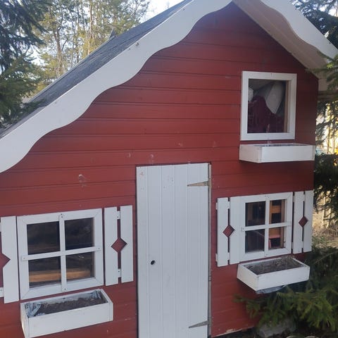 Puinen punainen leikkimökki, jossa on harjakatto ja kattohuopa. Mökissä on ikkuna ja pieni kuisti kaiteilla. Soveltuu pihaleikkeihin lapsille. Rakennus on maalattu punaiseksi, listat ja kulmat vaaleat. Mökki sijoitettu nurmialueelle ja se on tarkoitettu ulkokäyttöön.