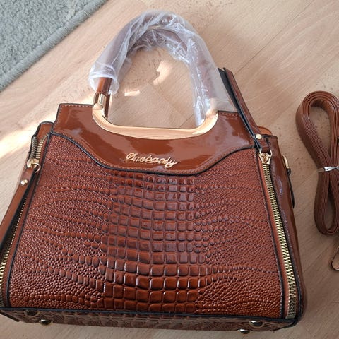 Uusi naisten tekonahkainen ruskea käsilaukku. Laukussa on kantokahva ja läppäkiinnitys metallisoljella, sisällä useita lokeroita, sekä irrotettava olkaremmi. Pinta on kevyesti kuvioitu ja mukana on irrotettava koristeellinen huivi kahvan ympärillä. Käsilaukun leveys 25cm ja korkeus 16cm.