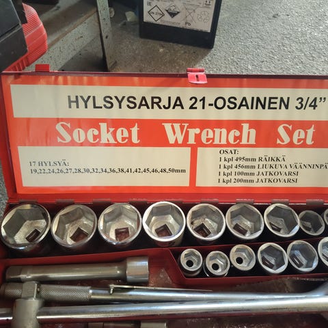 3/4" vääntiöllä 6 kulmaiset hylsyt 22, 24, 27, 30, 32, 36, 38, 41, 46 ja 50mm.