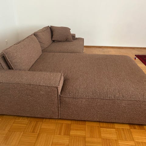 Sohva on valmistettu 2020, mutta on ollut pääosin konkurssipesän varastossa ja käytetty erittäin vähän. Selkänojan takaosa vaalentunut hieman auringonvalossa, muuten siistissä kunnossa. Sijainti Olari, Espoo.