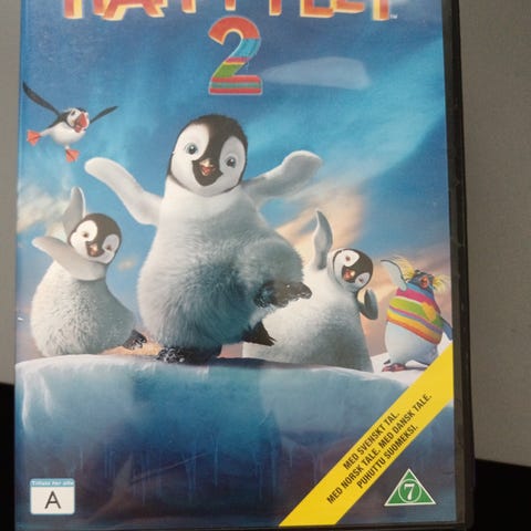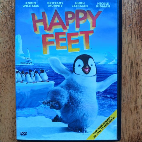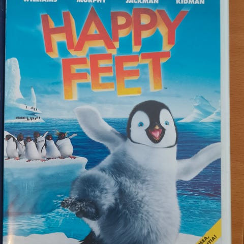 Happy Feet DVD-elokuva. Animaatioelokuva, jonka ikäraja on 7 vuotta. Levy on DVD-formaatissa ja kotelo on kuvassa näkyvä standardi muovikotelo. Elokuva kertoo pingviineistä ja sijoittuu jäiseen ympäristöön. Sopii katsottavaksi DVD-soittimella, joka tukee tavallista DVD-videomuotoa.