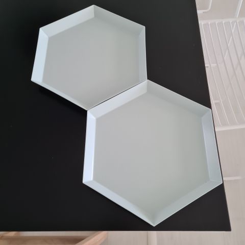 Hay design by cvz -merkkiset Kaleido-malliset pikkutarjottimet, koko XS = 11x19cm. Jauhemaalattua terästä, väri harmaa. Pari kolhua huomasin, niistä kuvat.