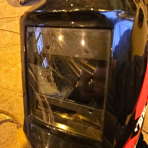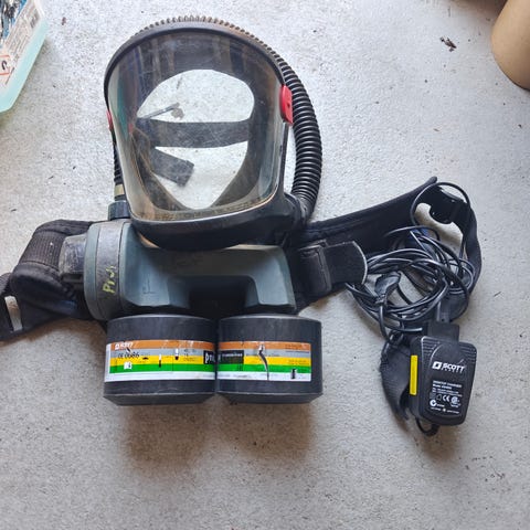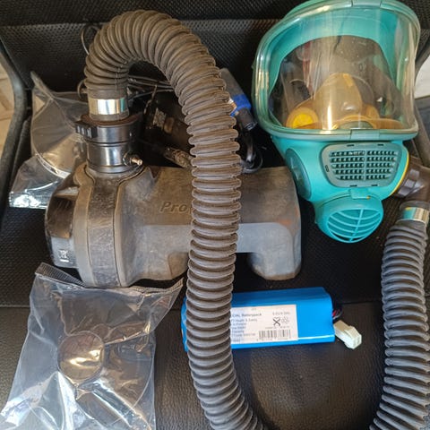 Mukaan laturi ja vyö. vyössä maalitahroja