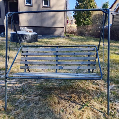 Muutaman vuoden pihakalustenäyttelyssä Hinnerjoella ollut keinu. Soveltuu kattamattomille ja katetuille terasseille. Tuote on valmistettu PEFC sertifioidusta puusta: FIN-PEFC-COC 1526.
