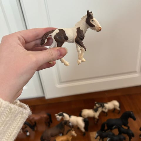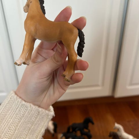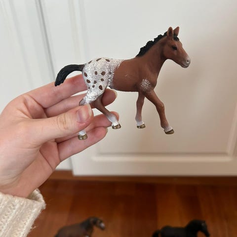 Schleich hevosfiguuri. Ruskea muovinen hevonen, jossa valkoiset vuohiset. Sopii leikkeihin ja kokoelmiin muiden Schleich-eläinfiguurien kanssa. Huomaa pienet käytön jäljet
