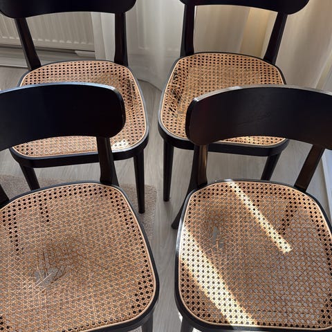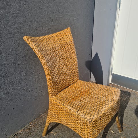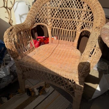 Kunnostettu, vanha rottinkikärry.