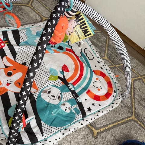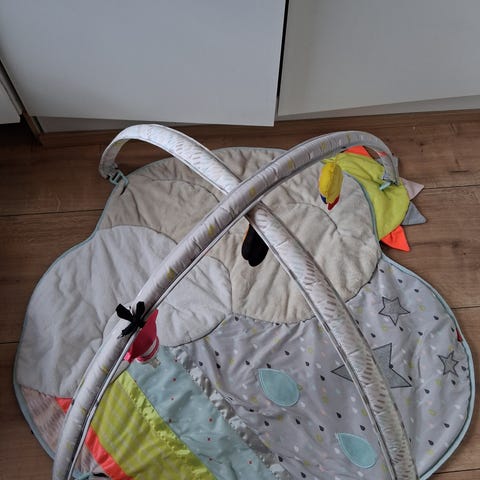 Vauvan leikkimatto ja neljä roikkuvaa lelua (viides puuttuu) sekä tyyny vauvan mahallaanoloa helpottamaan. Kaarissa paljon lenkkejä, joihin voi ripustaa myös lisää leluja.