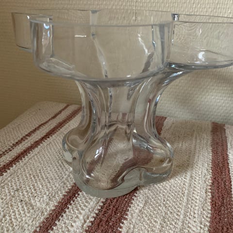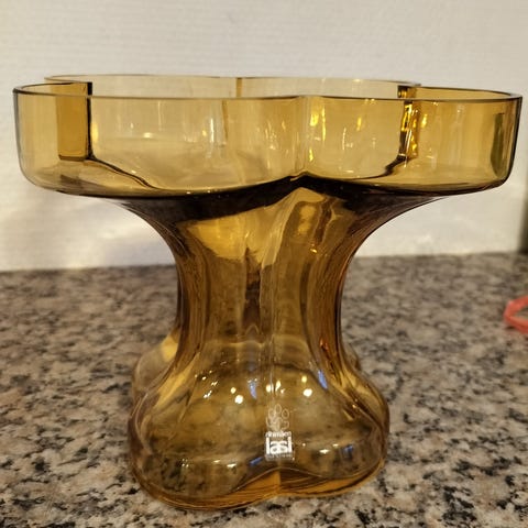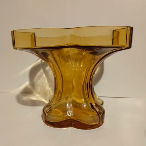 Riihimäen lasin Helena Tynellin suunnittelema Onnenlehti maljakko. Maljakossa on valitettavasti kaksi pientä lohkeamaa joista on kuvat myös. Muuten oikein hyvässä kunnossa!