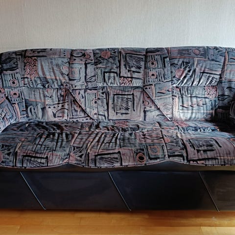 Kunto hyvä, kangas kestävää nahkan näköistä huonekalukangasta. Väri musta, valo vääristää vaaleammaksi. Toimiva mekanismi. Vain nouto Etu-Lyötystä.