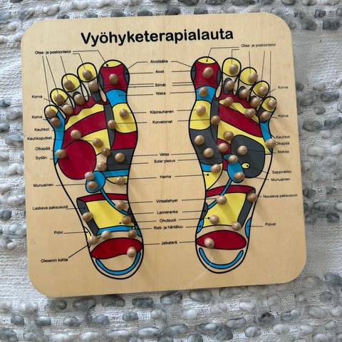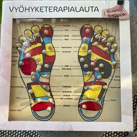 Tuote on suunniteltu käytettäväksi istuma-asennossa lattialla. Pakkauksen kyljessä on kaavio jalkapohjan akupisteistä, joiden alueita rullat hierovat. Soveltuu jalkapohjien ja kaarien mekaaniseen hierontaan kotikäytössä. Väri harmaa/oranssi, materiaali kovamuovia ja kumimaisia rullia.