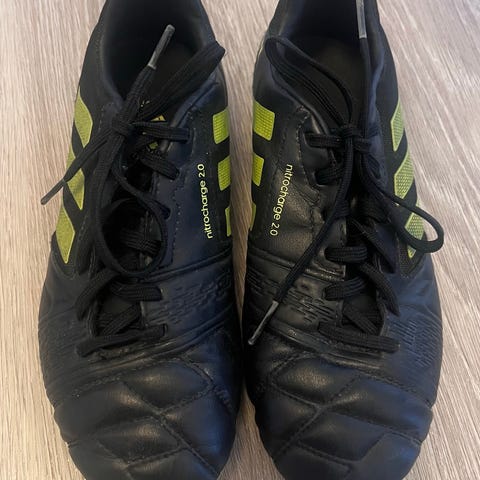 Adidas jalkapallokengät, koko 35. Väri musta sinisillä yksityiskohdilla ja punaisella nappulapohjalla. Nauhakiinnitys. Soveltuvat jalkapalloon nappulapohjan ansiosta, esimerkiksi nurmikentille. Kengät ovat kevyet ja matalavartiset, suunniteltu junioripelaajalle.
