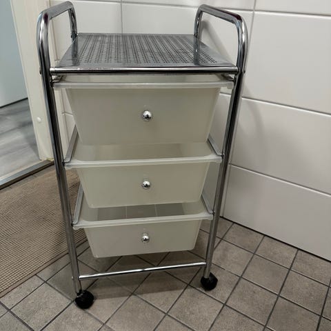 Valkoinen laatikosto, jossa neljä vetolaatikkoa. Laatikostossa on metalliset vetimet ja se soveltuu WC-kalusteeksi. Materiaali on puupohjainen levy tai vastaava kalustemateriaali.