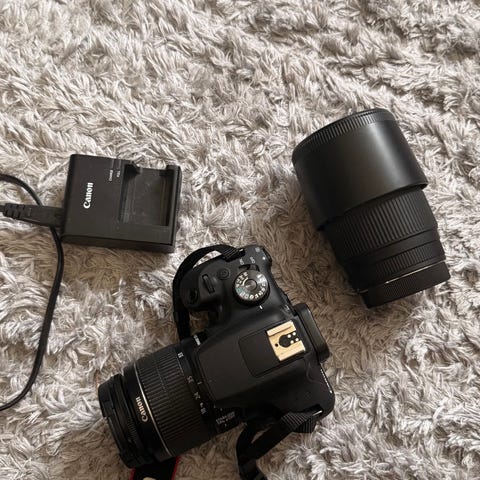 Canon EOS 550D digitaalinen järjestelmäkamera. Kuvissa rungossa on Canon-zoomiobjektiivi ja erillinen lisäobjektiivi sekä Canon-olkahihna. Mukana on myös Canon-kameralaukku kameran ja tarvikkeiden säilytykseen ja kuljettamiseen. Sopii valokuvaukseen, jossa halutaan vaihdettavia objektiiveja ja manuaalisia säätömahdollisuuksia.