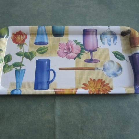 Vintage metallinen tarjotin, jossa hedelmäaiheinen koristelu. Valmistaja Daher Decorated Ware. Valmistusmaa Englanti.