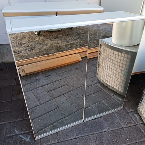 IKEA Lillången kylpyhuoneen peilikaappi valkoinen. Kokonaisuuteen kuuluu suorakulmainen peili, jonka sivuilla on avohyllyt pientavaroille, sekä erillinen kapea avohyllykkö.. Sopii kylpyhuoneeseen tai eteiseen säilytykseen ja peiliksi. Lisäksi mukaan valo kaapin päälle.