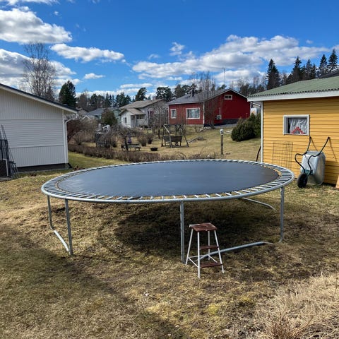 iSoprt trampoliini turvaverkolla. Pyöreärunkoinen ulkokäyttöön tarkoitettu trampoliini, jossa metallinen runko ja ylös asti ulottuva turvaverkko. Soveltuu pihalle lasten ja nuorten hyppimiseen ja liikkumiseen. Rungossa useita tukijalkoja vakauden parantamiseksi ja verkko kiinnittyy pystytolppiin koko trampoliinin ympäri. 4,3m halkaisija. Talveksi otettu matto aina pois. Erittäin hyvä.