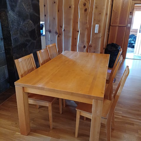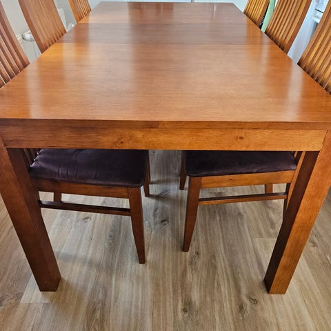 Puinen levitettävä ruokailu ryhmä. tuoleja 6kpl. Kuvien mukaisessa kunnossa. Nouto viimeistään 30.4