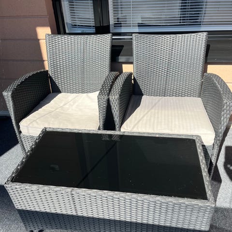 Polyrottinkinen terassikalustesetti, johon kuuluu kahden hengen sohva, kaksi nojatuolia ja sohvapöytä. Kalusteet ovat harmaata polyrottinkia ja niissä on vaaleanharmaat istuintyynyt. Sohvapöydässä on tummasävyinen lasikansi.