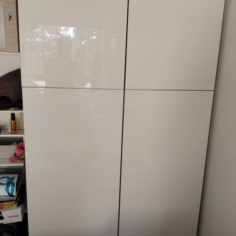 Ikea Bestå säilytyskokonaisuus. Molemmissa ovissa pienet kulumat/pinta rikki. Sisälle tehty omanlaiset kiinnitysratkaisut seinää varten (näkyy kuvissa). Päädyissä jäljet kun ollut isommassa kokonaisuudessa kiinni. Sisältä taustalevyt puuttuu mutta ei haittaa käyttöä kun seinää vasten kiinni.