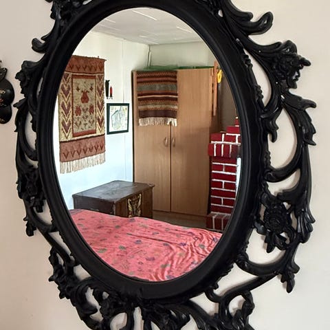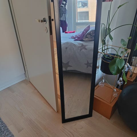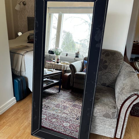 Peili mustalla ja puuta jäljittelevällä kehyksellä.