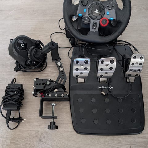 Logitech G29 ajosimulaattorin rattipoljinsetti ja vaihdekeppi. Pakettiin kuuluu Logitech G29 polkimet sekä manuaalivaihdekeppi. Ratti on verhoiltu mustalla materiaalilla ja siinä on useita ohjelmoitavia painikkeita sekä ohjaussauva. Poljinsetissä on metalliset poljinpinnat ja kumipintainen alusta. Vaihdekeppi on kiinnitettävissä pöytään puristinkiinnityksellä. Sopii ajosimulaatioihin yhteensopivilla alustoilla valmistajan ohjeiden mukaan. Kaikki on täysin toimivia ja käytön jäljet olevat vähäiset. Tarjoa yv:)